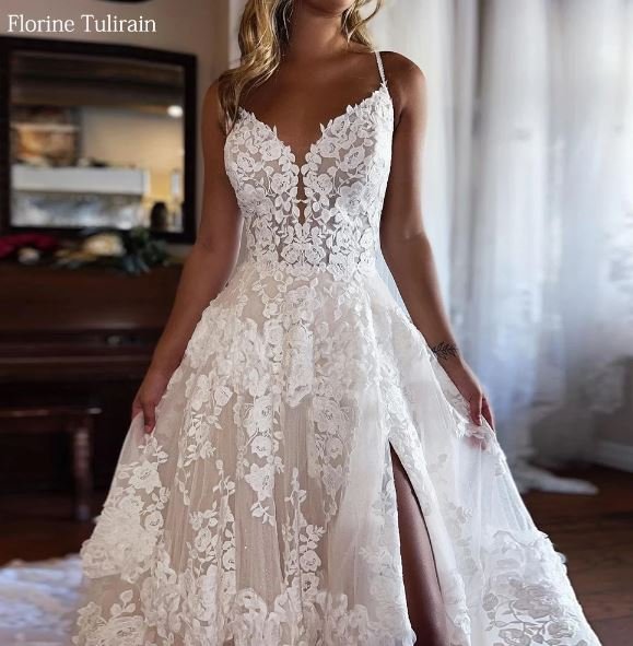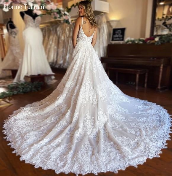 Bespoke V-neck A-line Wedding Dress with Spaghetti Straps Chapel Train Abito Da Sposa Completamente in Pizzo Macramè Backless |