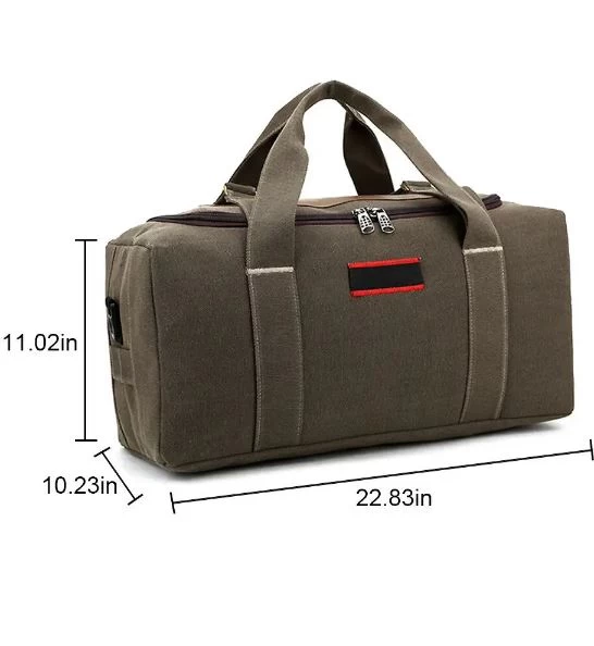 Features: 1. High quality: Made with high quality and durable canvas material,lined with polyester cotton cloth. 2. Simple Design: Main compartment with easy-access U-shaped opening and adopt two-way design zipper, smooth and durable to use. 3. Multi-function: Can be used as a tote/shoulder bag, or messenger bag with the detachable and adjustable shoulder strap. 4. Large Capacity: 22" Main compartment stands tall for easy packing your clothes, shoes , umbrella, water bottle, etc. 5. Occasion: Canvas duffel fits versatile occasions, like daily use, weekend outdoor activities, business trip, overnight trip, camping, hiking, climbing, sports, fishing, etc. Enough room for clothes and traveling necessities.