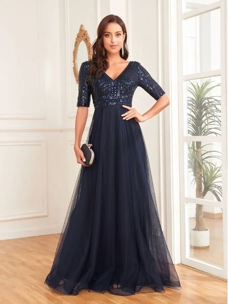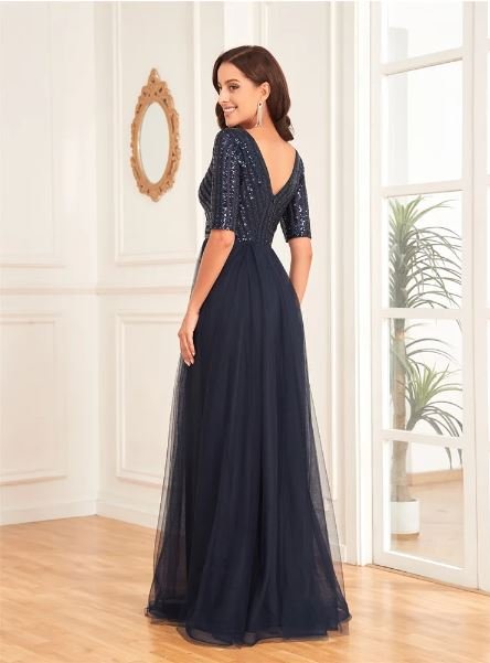 XUIBOL Elegant Short Sleeve Gown V Neck Blue Sequin Evening Dress Tulle Wedding Party Prom Cocktail Dresses For Women Vestido |